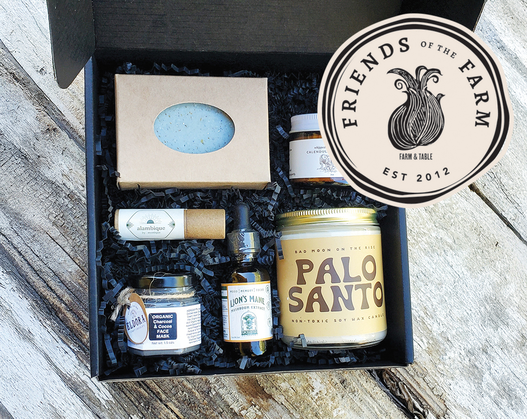 Give the gift of curated beauty & wellness products. Each box includes: Whipped Tallow Body Butter from Sile Pastures, Lip Whip from Alambique, Blue Corn y Comunidad Vegan Organic Soap from Sunshine Alchemist, Palo Santo Soy Candle from Bad Moon on the Rise, Charcoal & Cocoa Face Mask from Eldora Chocolate, and Lion’s Mane Extract Tincture from Enchanted Farms Mushrooms.
