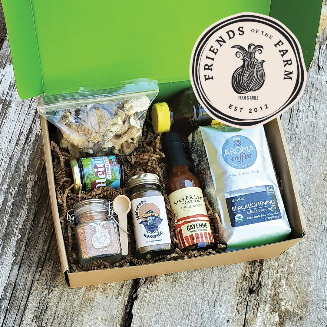 Give the gift of curated local pantry products. Each box includes: Black Lightning Coffee from Aroma Coffee, Mixed Mushroom Crunch from Enchanted Farms Mushrooms, Cayenne Fermented Hot Sauce from Silver Leaf Farms, Green Chile Shroomami – Umami Seasoning Blend from Midnight Disco Fungi, Raspberry Jelly from Heidi’s Raspberry Farm, Pure Natural Honey from B’s New Mexico Honey Farm, and Sumac Salt from Farm & Table.