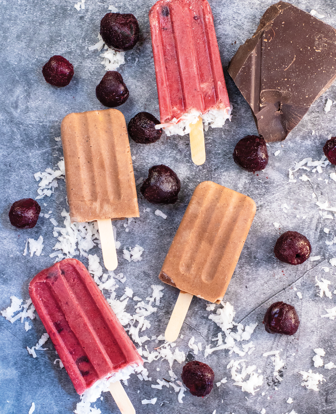 - Cut remaining 1/4 pound of cherries in half; add to the Popsicle molds, and fill with cherry mixture. Use a skewer or chopstick to break up any air bubbles in the mixture, leaving a gap at the top of each mold for adding shredded coconut. Pop the molds into the freezer for 30 minutes.