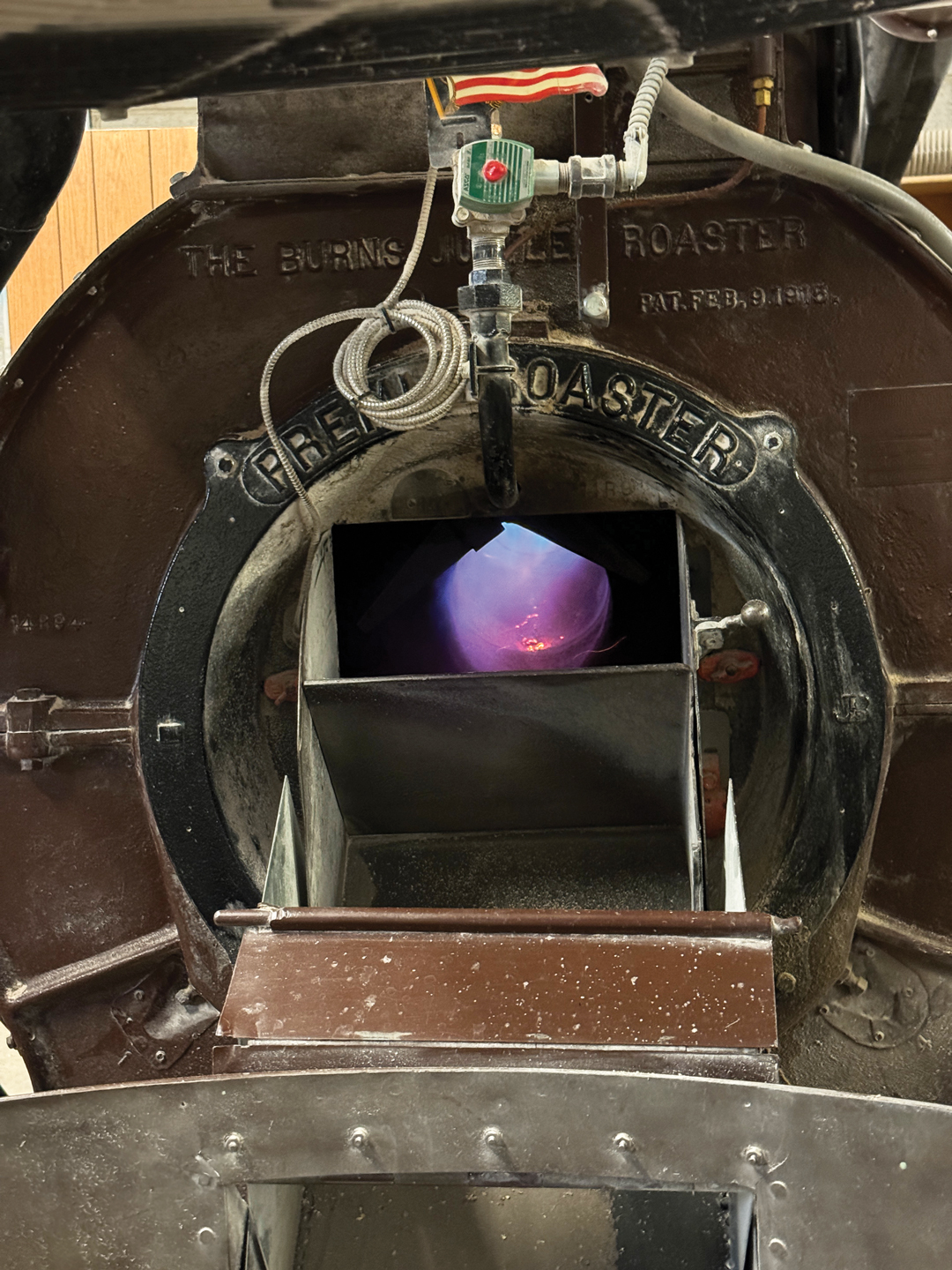 Fire burning in Torres’s Burns Jubilee gas roaster, patented 1915; Torres’s first mill, from his mother’s kitchen.