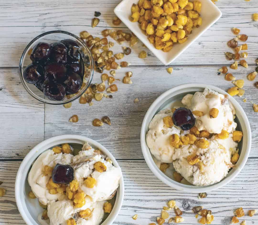 - Put a layer of the ice cream into a 9x5-inch loaf pan or similar-size pan. Drizzle with the caramel sauce. Add another layer of ice cream and another layer of caramel sauce. Freeze overnight. Scoop and serve with a sprinkle of corn nuts and a candied cherry on top.