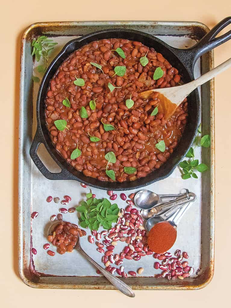 Many recipes use bacon or ham hocks to flavor their beans, but sticking with a basic bean recipe, we impart smokiness with chicos, some fat with the bison tallow, and spice with red chile powder.