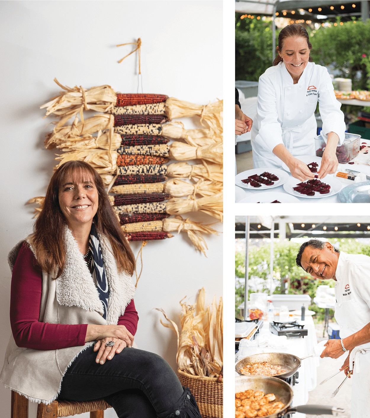 Left: Lois Ellen Frank in her home. Right: Chef Frank, above, and Chef Walter Whitewater, below, of Red Mesa Cuisine catering an event.  Photos by Gabriella Marks