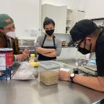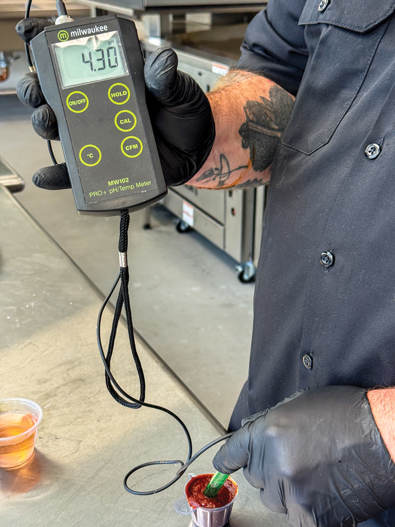 Key cooking the base for gochujang at Barelas Community Kitchen and checking the gochujang pH levels.