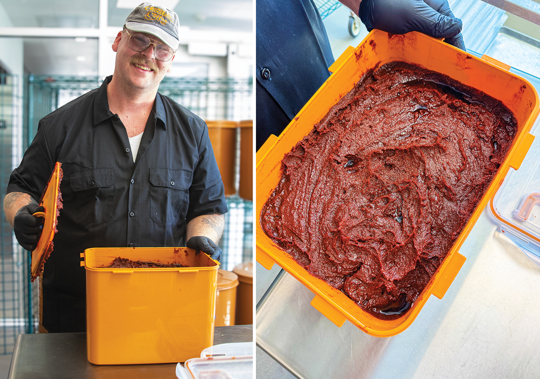 Left: Kyle Key of NM ChileJang. Right: Fermentation vessel full of gochujang.