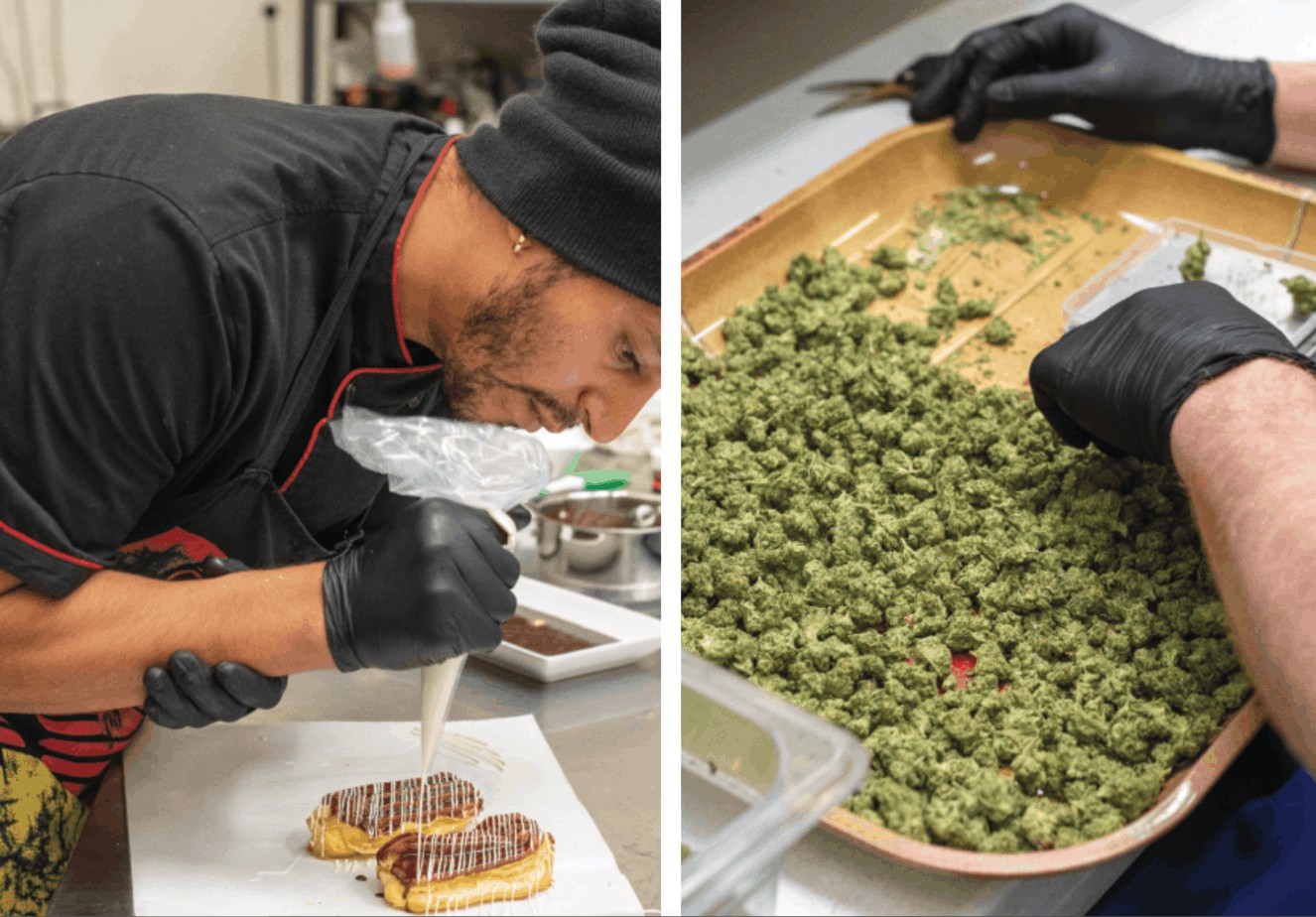 Left: Carlos Torres, head chef at Best Daze, icing eclairs. Right: Sorting cannabis flowers at Best Daze. Photos by Stephanie Cameron.