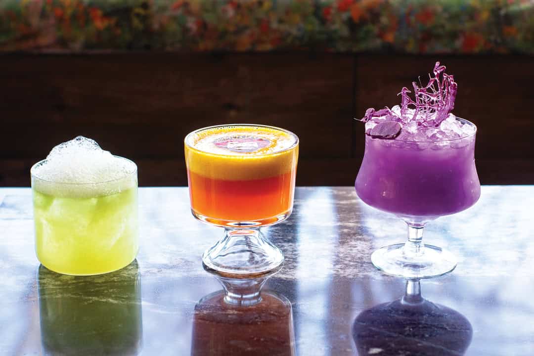 Left to right: Sorry, Not Sorry, with cilantro-infused espadín mezcal, dry curaçao, lime, and salt air; Happy Little Accidents, with tequila, ling hui mui– infused rum, guava, lemon, and passion fruit foam; and Ursula, with vodka, ube, Calpico Japanese soda, lavender, and lavender sugar “tentacles.”