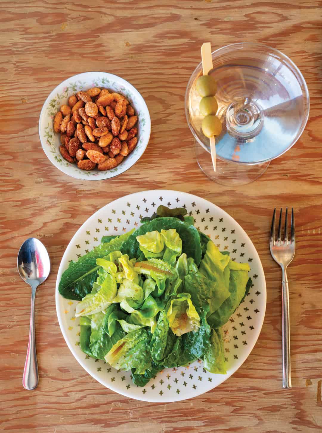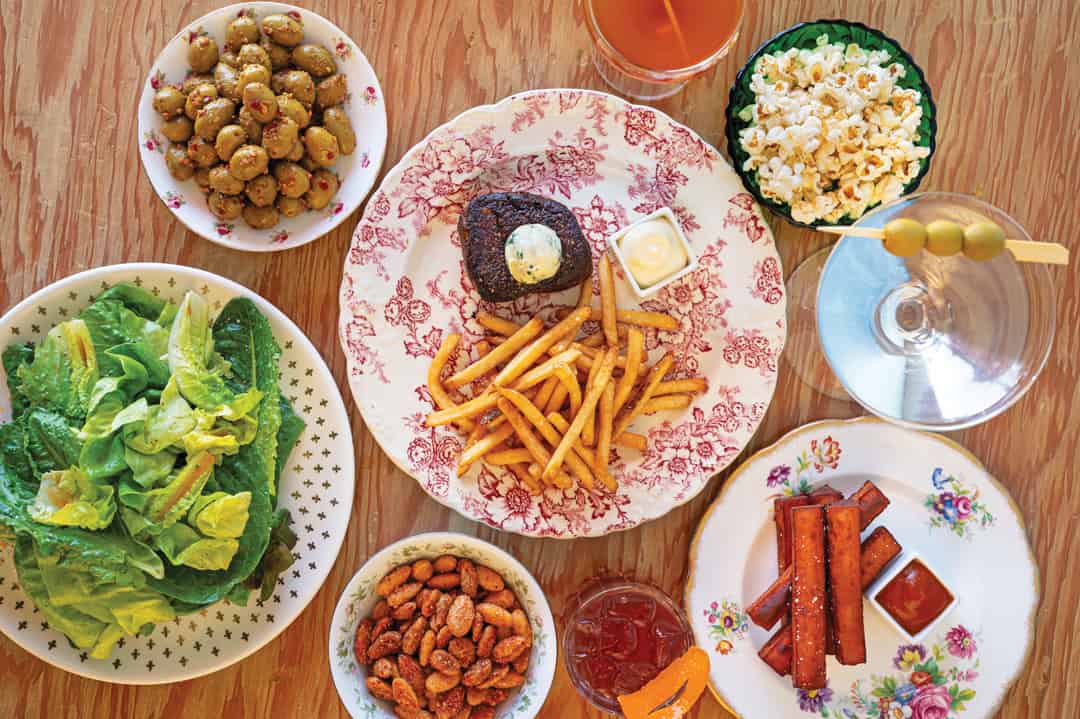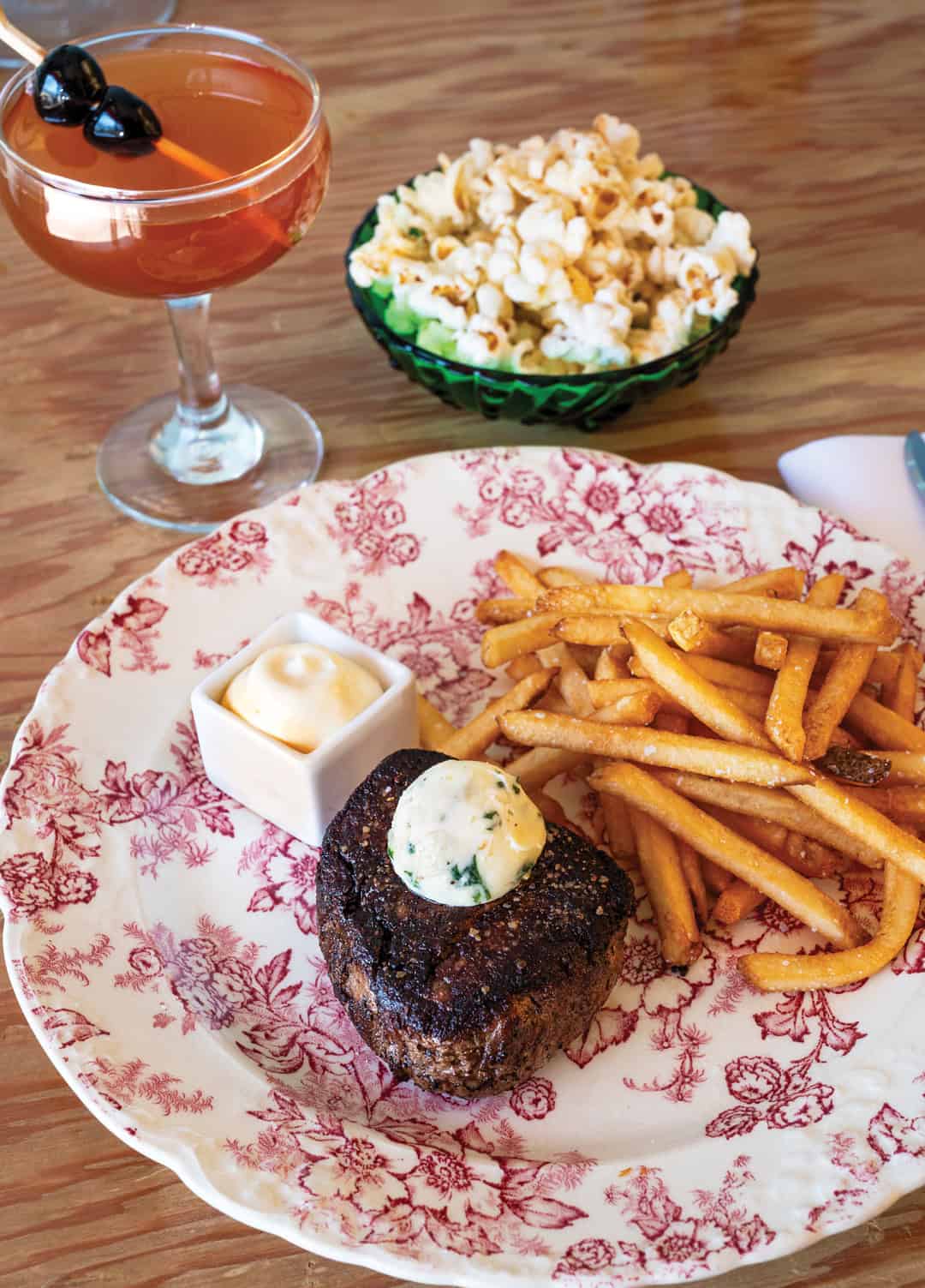 Steak Frites (New Mexico beef petit filet, aioli, and maître d’ butter) with a manhattan and popcorn. Right: Simple salad (local lettuces and Grandma Bussey’s french dressing) with a martini and sweet and spicy almonds.