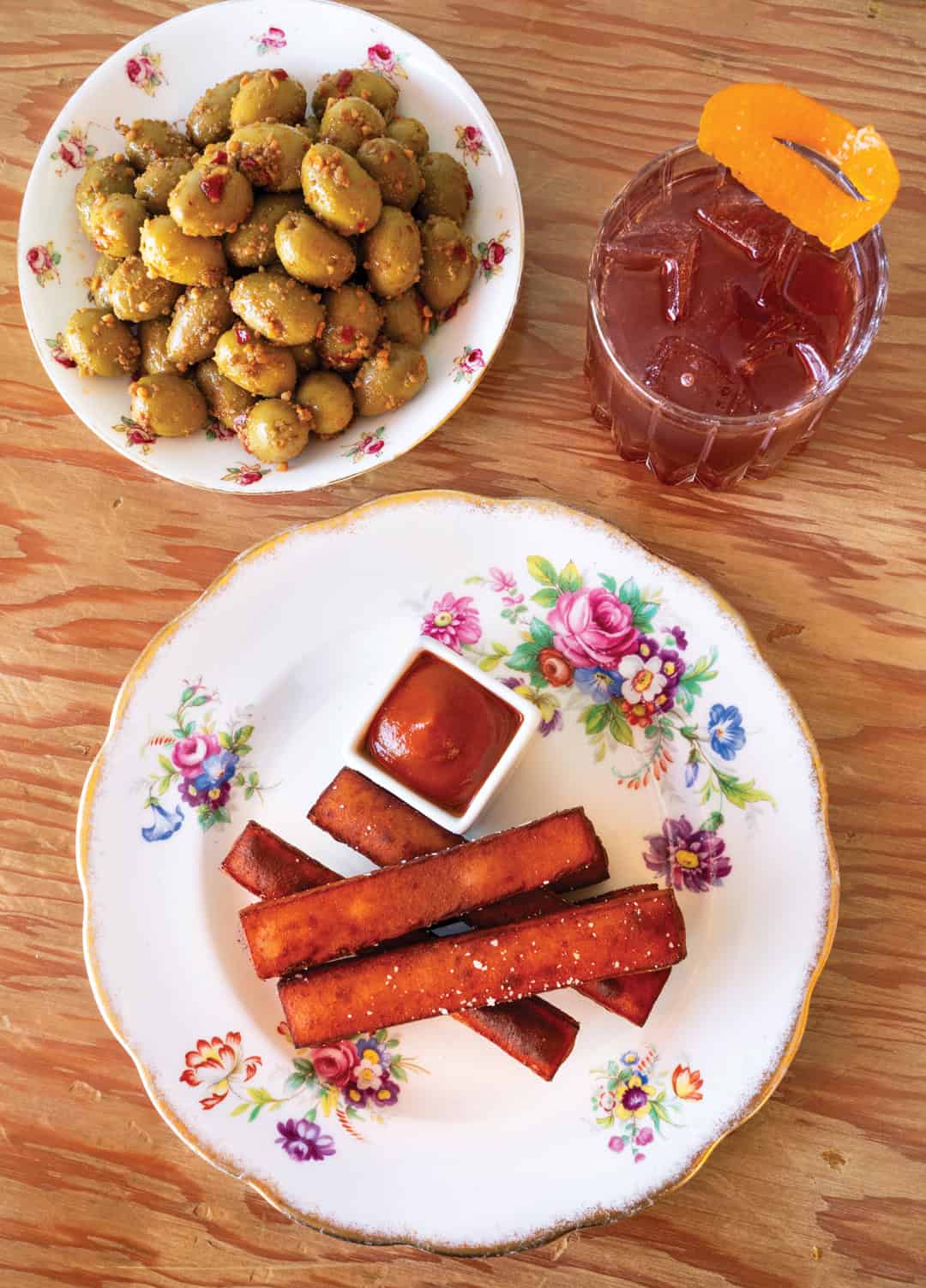 Left: Jennifer James with her dog, Rocky. Right: Chickpea fries and house ketchup with Roadrunner cocktail and orange and fennel–marinated picholine olives.