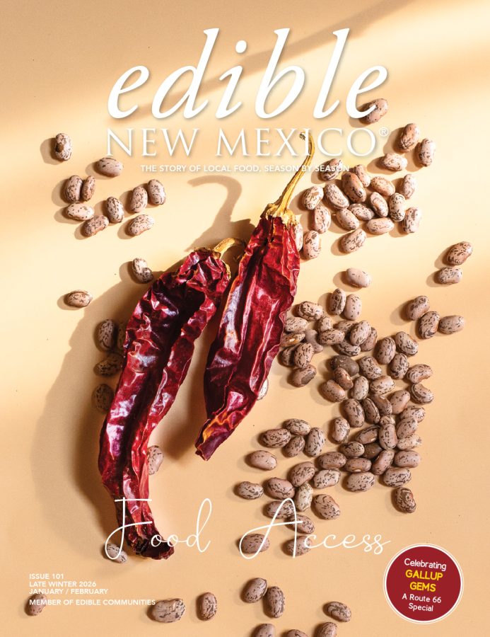 This issue of edible New Mexico is dedicated to food access: not only where food comes from but how food flows and whom it feeds. In one feature, checking in with food banks, pantries, and hubs at a precarious time, Sarah Mock finds people working to develop more holistic modes of distributing food to those who need it. In another, Emily Arasim Beltrán shares what she’s learned from a deep dive into the past, present, and—hopefully—the future of local grocery stores in rural northern New Mexico. Traveling to Shiprock, Ungelbah Dávila visits with a visionary duo who started their own nonprofit in order to build on—and share—their success by training other Native farmers and food entrepreneurs. We also learn about a young project bringing people together around the garden on Santa Fe’s Southside, and we get to know a few of the farms who serve the state’s schools and senior centers, from Bloomfield to Albuquerque.