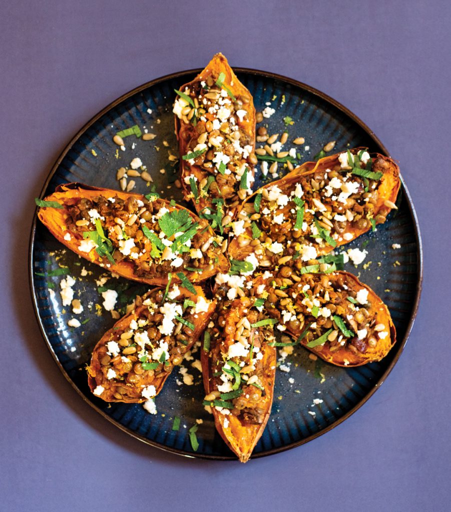 Loaded Sweet Potatoes with Harissa, Lentils, and Mushrooms