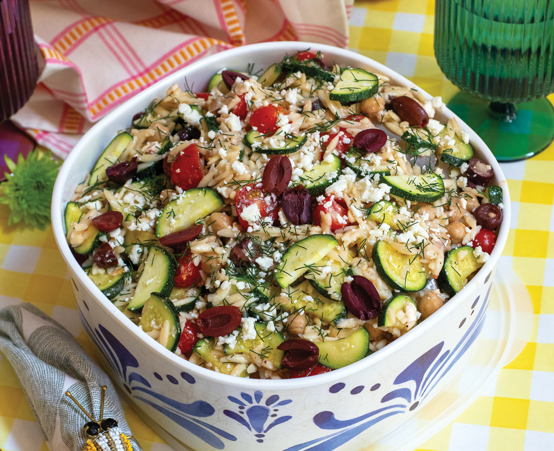 Orzo makes a great pasta salad base because it has a firm and toothsome texture (as long as you don’t overcook it), but you can substitute fusilli, orecchiette, or any other short pasta that’s in your pantry. Adding warm grilled vegetables is also an option if you’re making the salad the day of your picnic; I love the addition of grilled eggplant and peppers, but this recipe serves as a base for creativity. Not a dill fan? Try tarragon or basil.
