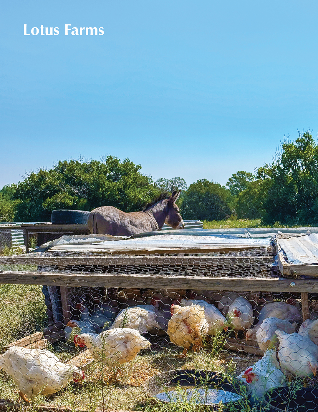“This pasture, when we got it, was just a hodgepodge,” Grant Wilson says as we walk the periphery of the mountain meadow that’s home to the chickens of Lotus Farms. Storm clouds crown the mountain, and in moments they’ll unleash a downpour, prompting us to run for cover in a nearby shed. But for now, we stand and watch the chickens hopping and pecking in a long row of movable wood-framed shelters, known as tractors. “Running birds has created this great soil diversity,” he says.