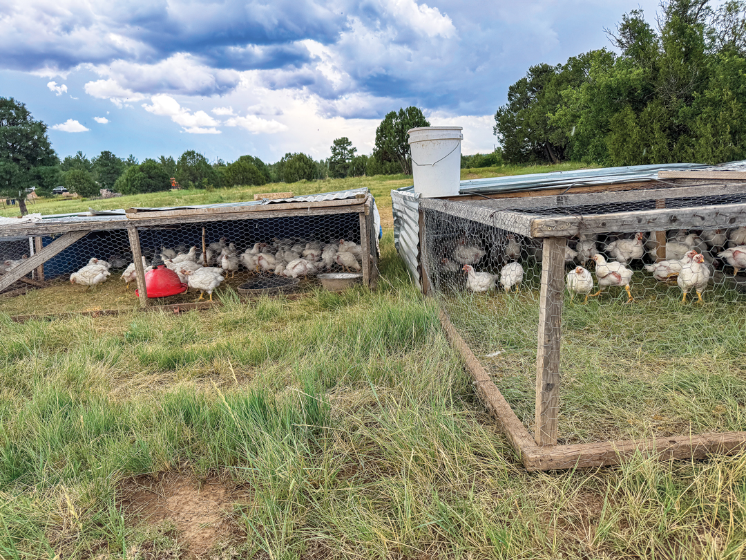 Lotus Farms uses the pastured poultry model championed by Joel Salatin. Grant and Val Wilson started with one tractor, raising birds for family and friends, then moved to five. Now they raise between two and four thousand chickens a year. The tractors, each housing about seventy-five birds, are moved daily, bringing the birds to fresh pasture. It’s important not to crowd them; they need room to move, to kick and peck, micro-tilling the pasture as they pick out bugs and blades of grass. All the grass they eat is native to this meadow—hence their dark yellow fat, high in omega-3 proteins. They also eat grain from Embudo Valley Organics, an organic blend including corn, soybean, and alfalfa that, Val says, “smells like granola.”
