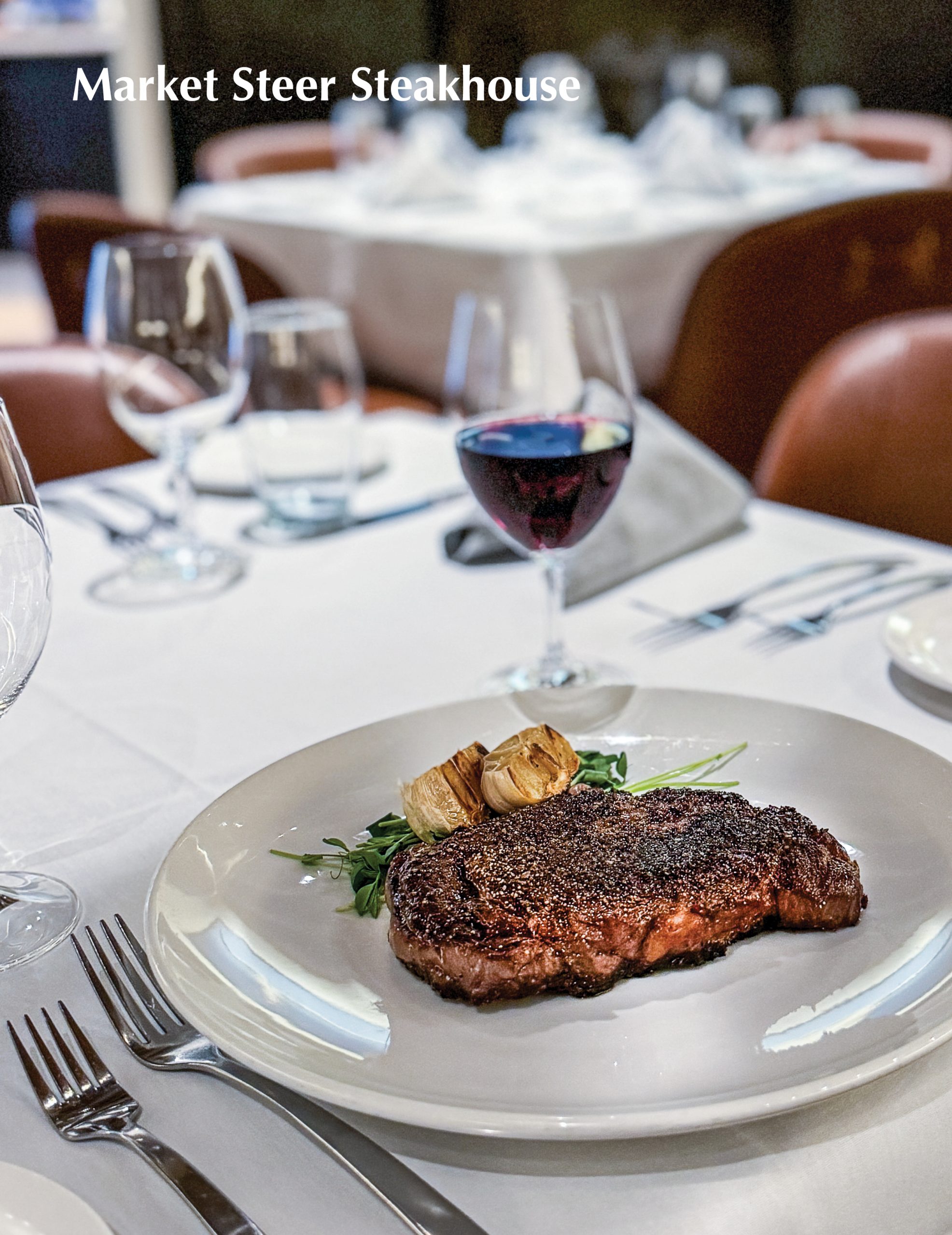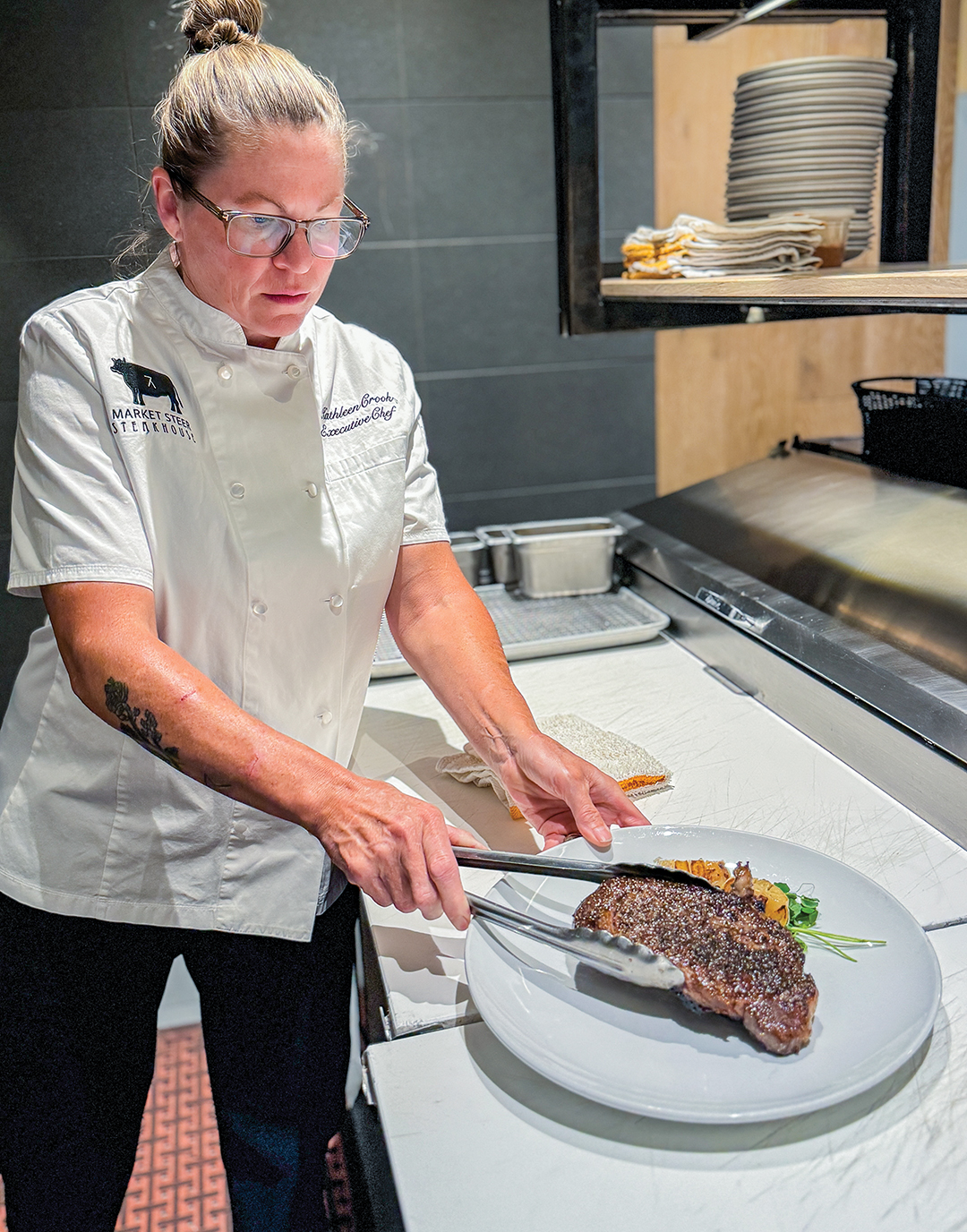 “Is that the New Mexico cut?” the woman seated to my left asks admiringly, eyeing the rather glorious steak I’ve just been served. Indeed, it is: a sixteen-ounce Lone Mountain Wagyu rib eye cut that afternoon by Chef Kathleen Crook and prepared, with perfect timing, in the overfired broiler at Market Steer. “It runs about 1,800 degrees,” Crook tells me later. “I have plenty of scars to prove how hot it is.”