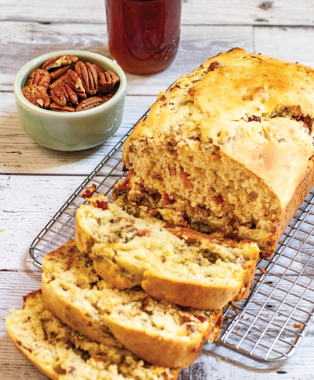 This sweet and savory bread is a spin on Louisiana pecan bacon bread, which likely evolved from traditional Southern pecan-based baked goods and the region’s love for incorporating cured pork in all sorts of dishes. Substituting green chile for bell peppers is a classic New Mexican move and adds the spice this recipe begs for. Spread some butter on it and enjoy it while it’s still warm.