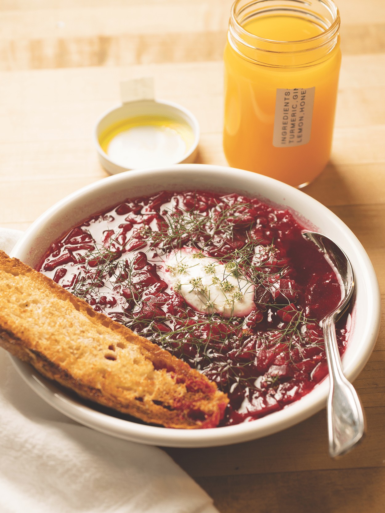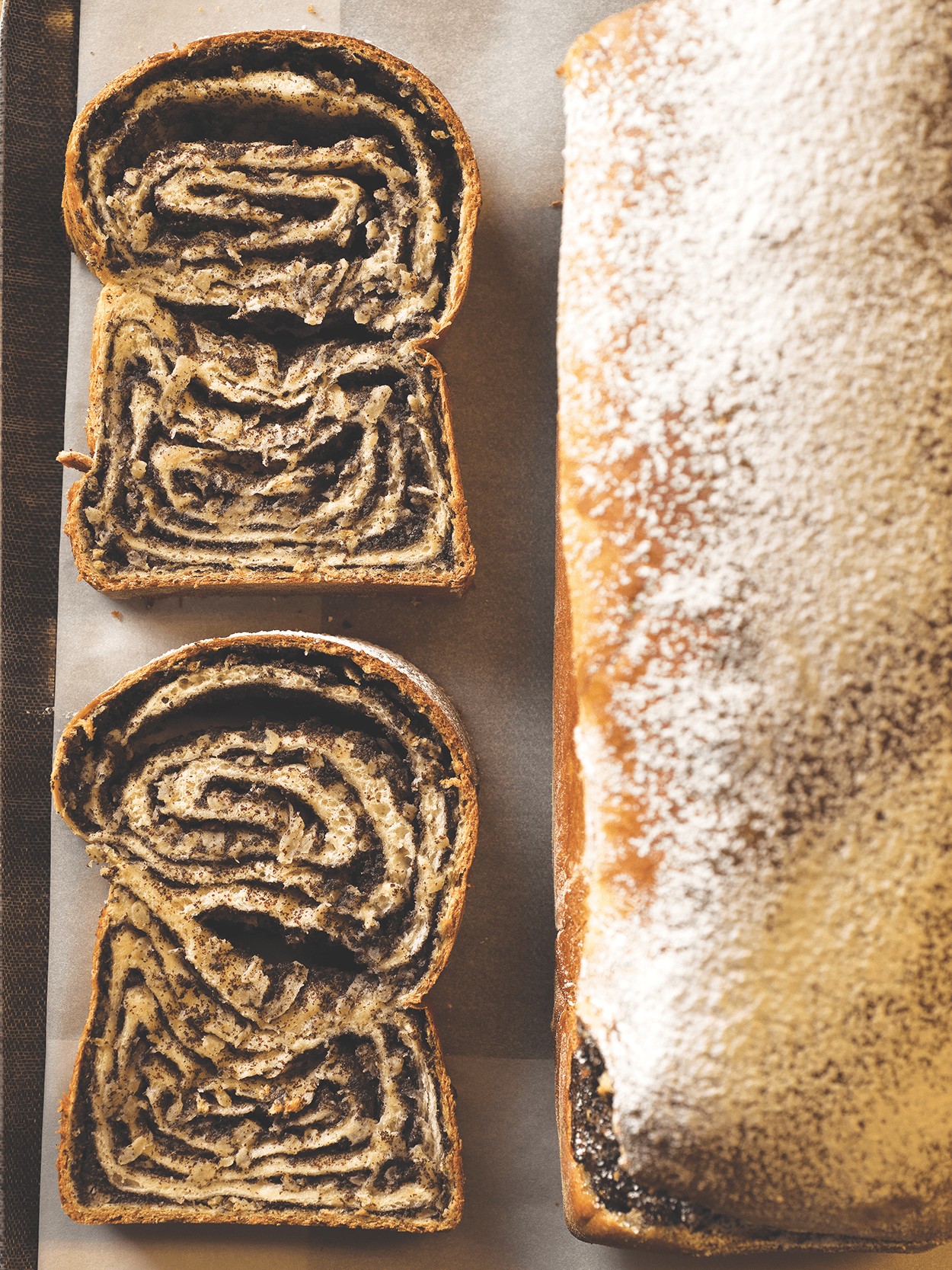 Left: Borscht made with beets, sauerkraut, potatoes, yogurt, and coriander sauce. Right: Makovnik, a rolled yeast bread with ground poppy seed and grated apple.