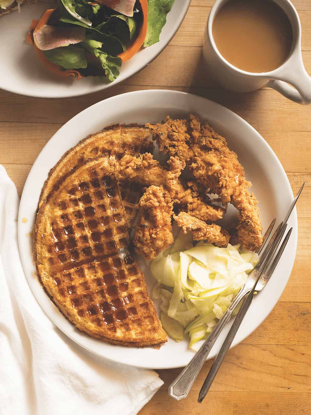 Left: Kolaches filled with housemade strawberry-rhubarb preserves and a Slovakian sweet cheese called tvarog. Right: Cornmeal waffles and buttermilk fried chicken with green apple and fennel slaw.