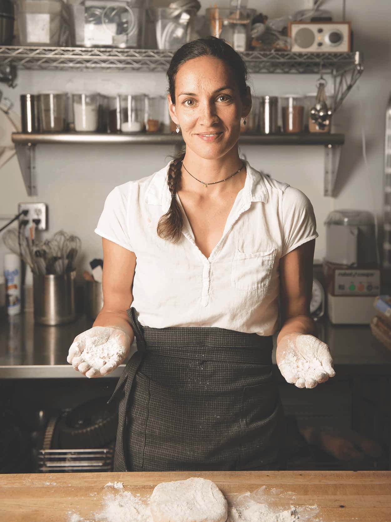 Like her food, O’Brien and her café reflect a cultivated simplicity. The space she has created at Dolina is warm and quiet, with grayscale walls and sound-proofing panels on the painted white ceiling. It feels markedly different—more serene, less chaotic—than many spaces in Santa Fe. The walls are decorated like a pantry, with a few dried garlic braids and some dried mushrooms on string. O’Brien made these herself, thinking of her grandmother’s pantry, and was astonished at the intricacy of threading dried mushrooms—a labor of love, she calls it. O’Brien herself is tall and radiates an incredible ease, dressed in layered linen, shades of gray like her walls. “Simple isn’t always good to people,” she concedes, “but it keeps me calm.” Unlike some in the food industry, who prize rapidity and extreme machismo, O’Brien maintains a balanced lifestyle, riding her bike from home to start baking around 5am and then biking back to take her kids to school. Though it can certainly be overwhelming at times, O’Brien has found immense support in the women of the Santa Fe food industry, who lift one another up and send friends to each other’s restaurants. She has recruited locals, like designer Emily Henry for Dolina’s interior, and help from back home, including an indigo textile artist in Slovakia to make fabric for pillows. For a few months this year, O’Brien’s mother traveled from Slovakia to bake alongside her. With a committed community behind her, O’Brien is able to keep her attention on details. The pillows, she notes, are printed with flowers from the lipa tree, from which she grew up making tea. “It really brings me back home,” she muses, as we savor the poppy seed cake and warm apple strudel she’s just whisked out to us. In every aspect of Dolina, O’Brien’s philosophy is clear: making food is a way of taking care of people.