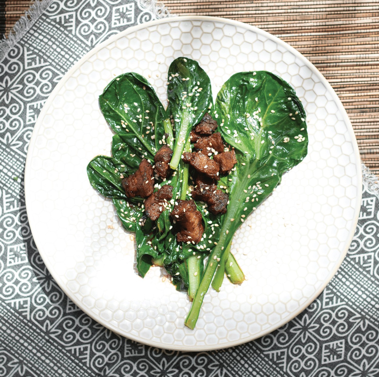 Add remaining sesame oil and tatsoi to skillet; once wilted, add sauce. Reduce heat to medium-low, and cook until sauce slightly thickens.